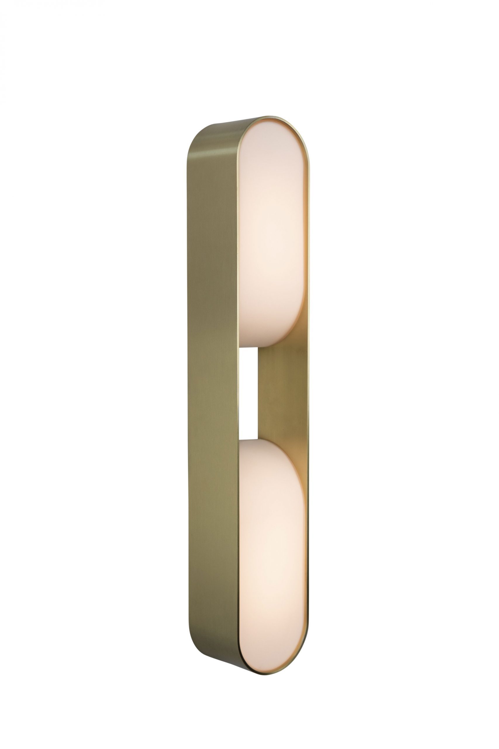 Петля из латуни, обработанная вручную, нежно удерживает наклонный диффузор из белого стекла, излучающий тепло освещение. Loop Double изготавливается на заказ вручную. Дизайн Дейрдре Джордан.