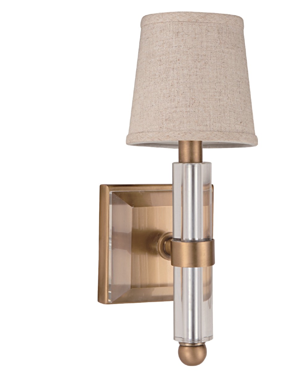 Лаконичное настенное бра из цельной латуни, хрусталя с льняным абажуром благодаря универсальному дизайну будет гармонично завершать интерьеры как спальных, так и ванных комнат