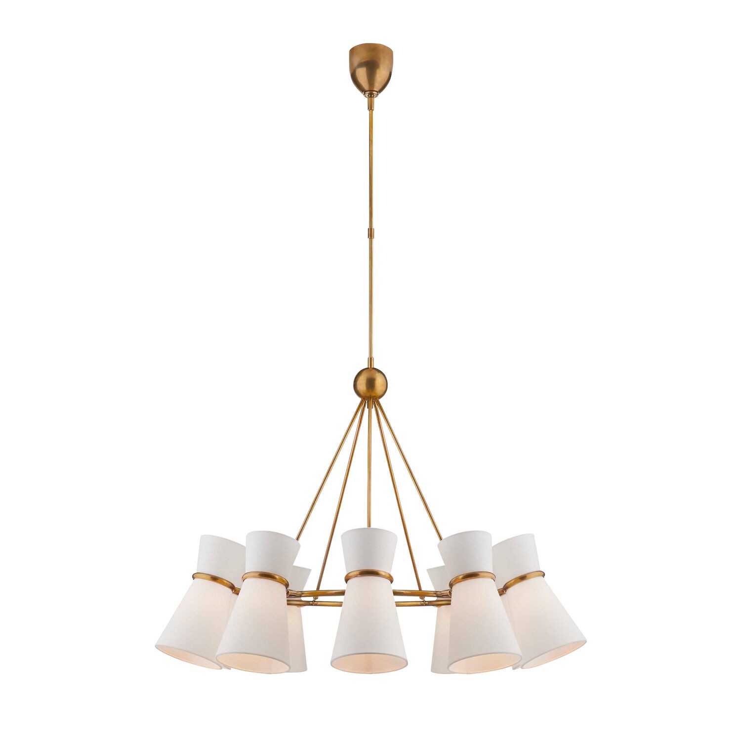 Люстра на обруче из латуни с шестью разделенными плафонами из ткани. В этой люстре классического американского дизайна присутствует идеальное сочетание, казалось бы, не сочетаемых между собой материалов — латуни и ткани слоновой кости. Ткань придает свежести и воздушности, расширяя пространство и придавая дополнительный блеск, плафон из ткани украсит помещение мягким рассеянным светом, а состаренная латунь…