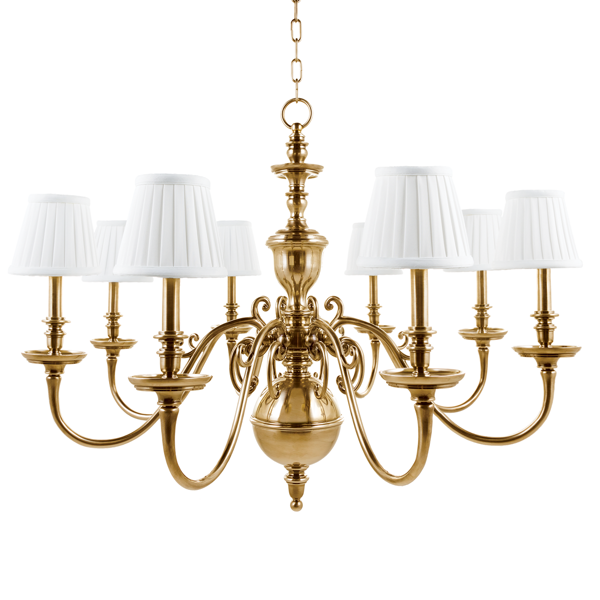 Изысканая люстра с каркасом из латуни и абажурами из искусственного шелка белого цвета. Конический абажур декорирован плиссировкой и закреплен на изогнутом стержне золотого цвета. Благодаря традиционному колониальному дизайну это бра добавит элегантный акцент в ваш интерьер.