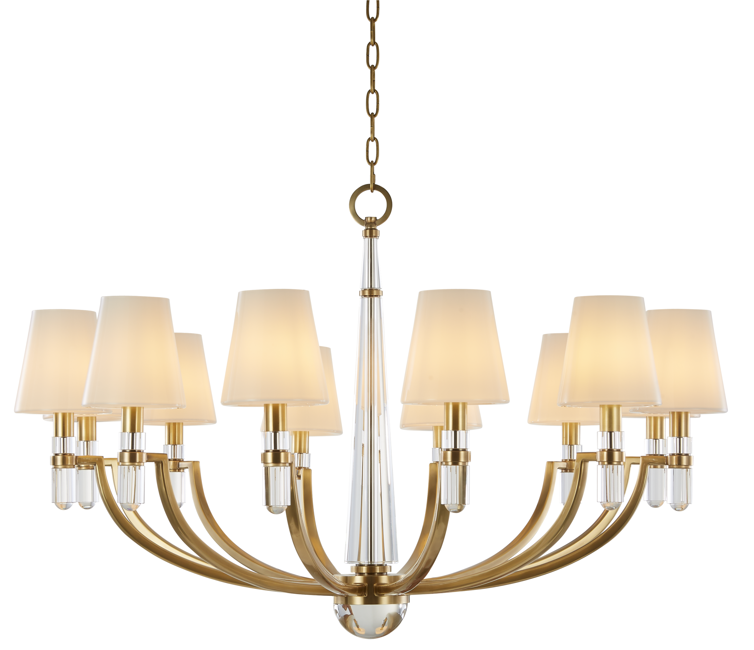 Дизайнерская люстра Dayton Chandelier от американского бренда Hudson Valley на 12 рожков сочетает в себе мощные дужки из литой состаренной латуни латуни с прозрачным кристаллом, что придает чистоту и изысканность. Светильник выполнен в стиле американская классика.Каждый сужающийся рычаг поднимается от центрального стержня, удерживая хрустальную колонну, увенчанную четким расширяющимся плафоном. Главный центральный кристалл представляет собой удлиненный конус, завершающийся полукруглым хрустальным шаром.
