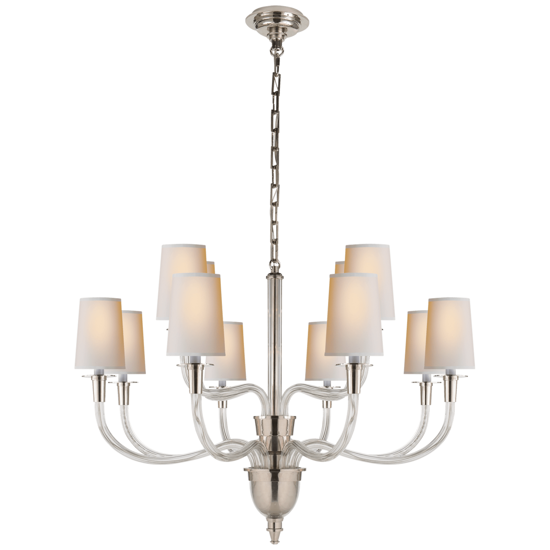 Большая двухуровневая люстра из покрытой хромом латуни, стекла с кремовыми тканевыми абажурами наполнит теплым уютным светом вашу гостиную или спальную. Модель выполнена в классическом американском стиле. Хорошо будет смотреться в как в современных , так и в традиционных интерьерах.
