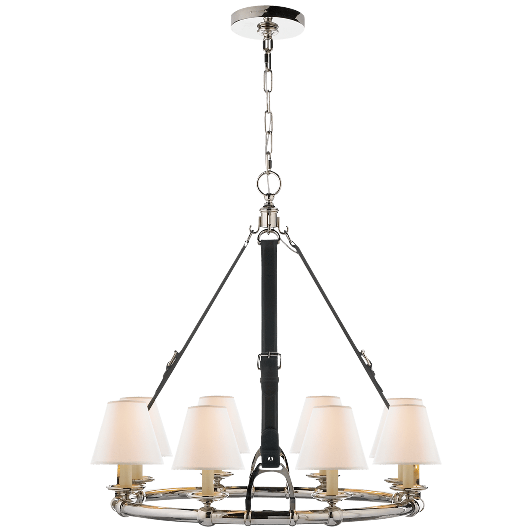 Образец скромной роскоши от Ральфа Лорена — люстра  Westbury Chandelier в цвете полированный никель с ремнями шоколадной или темно-синей кожи с полотняными абажурами.