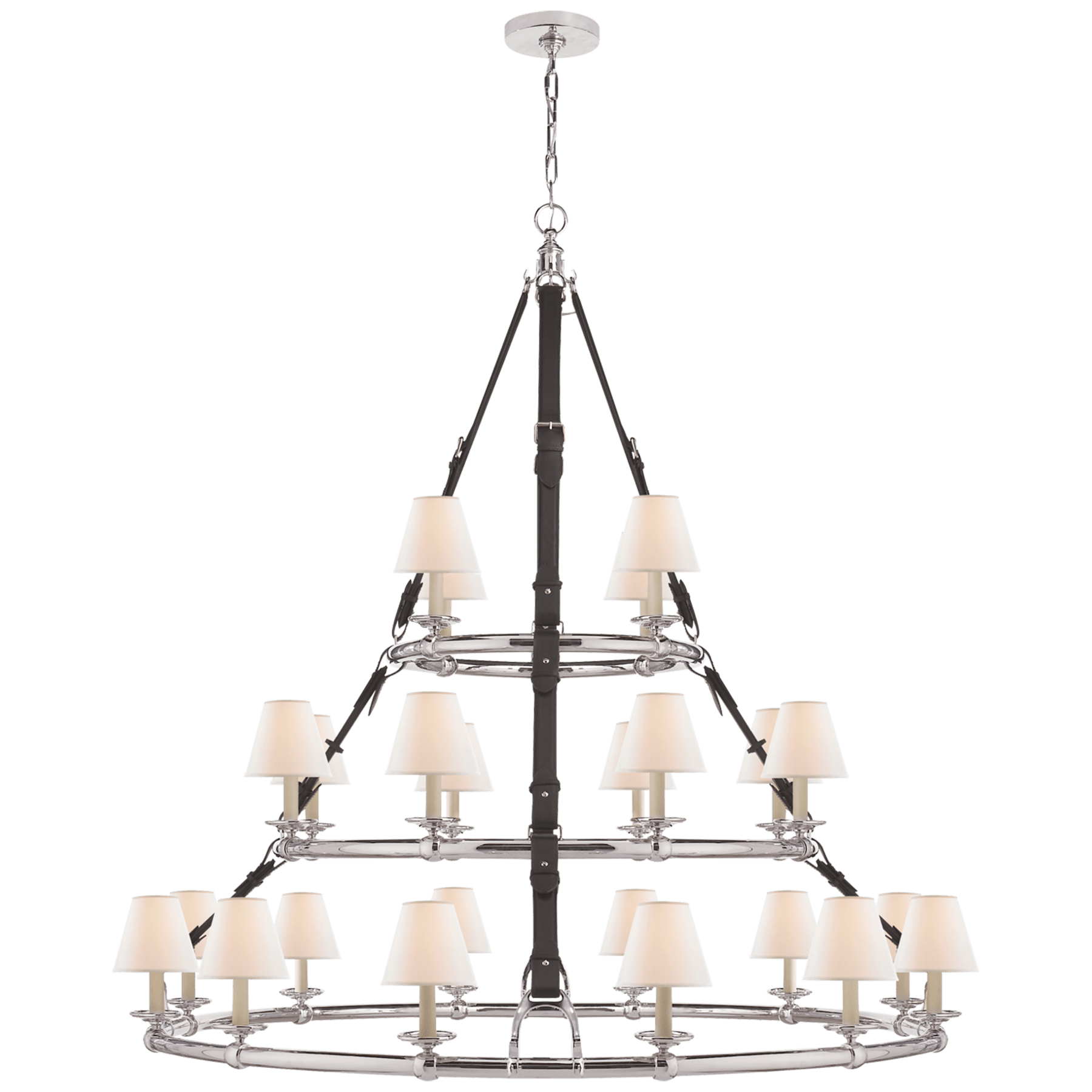Westbury Triple Tier Chandelier in Polished Nickel and Chocolate Leather with Linen Shades. Данная люстра является самой большой в коллекции Westbury от Ralph Lauren. Она прекрасно подойдет для создания второго света в загородных домах или двухэтажных квартирах.