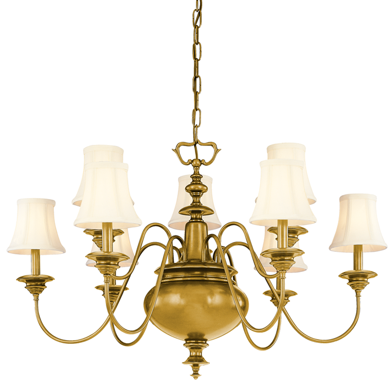 Элегантная люстра в стиле английской классики. Этот светильник не так прост, как кажется на первый взгляд. Качественный латунный сплав позволяет держать достаточно объемный плафон на тоненьком основании, что создает ощущение парения в воздухе. Приобретите эту люстру и она вам точно не наскучит.
