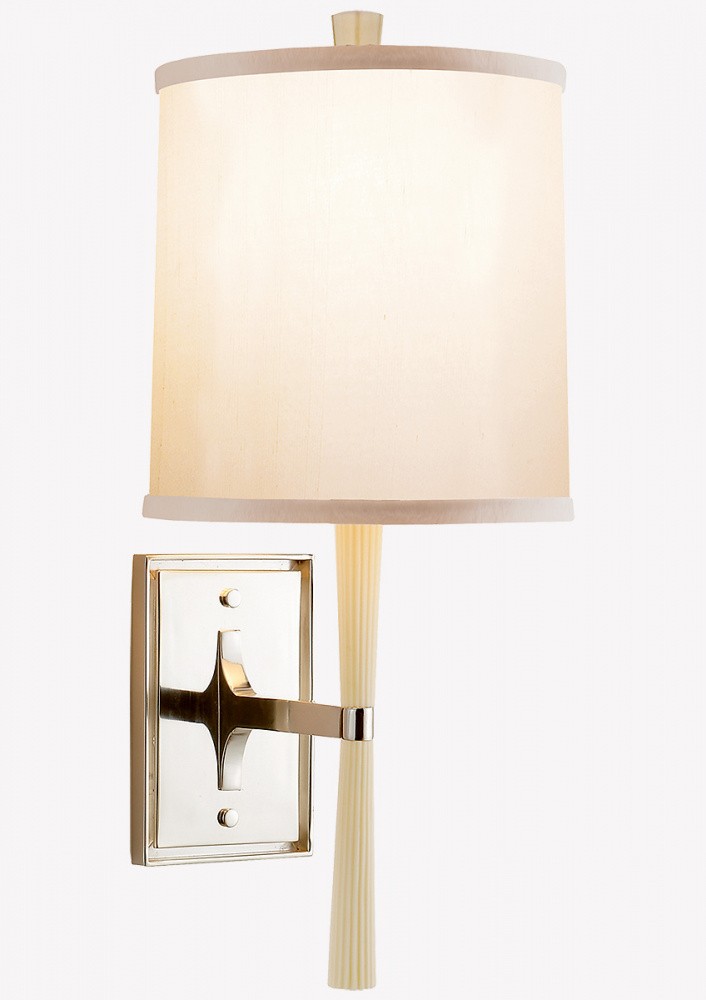Настенное Бра Refined Rib от премиального американского дизайнера Barbara Barry. Основание латунное, покрыто античным никелем. Цоколь украшен двумя коническими никелированными деталями. Абажуры в форме усеченного конуса, с отделкой песочной хлопковой тканью. Работает от двух лампочек максимальной мощностью 60 Ватт тип Е14.