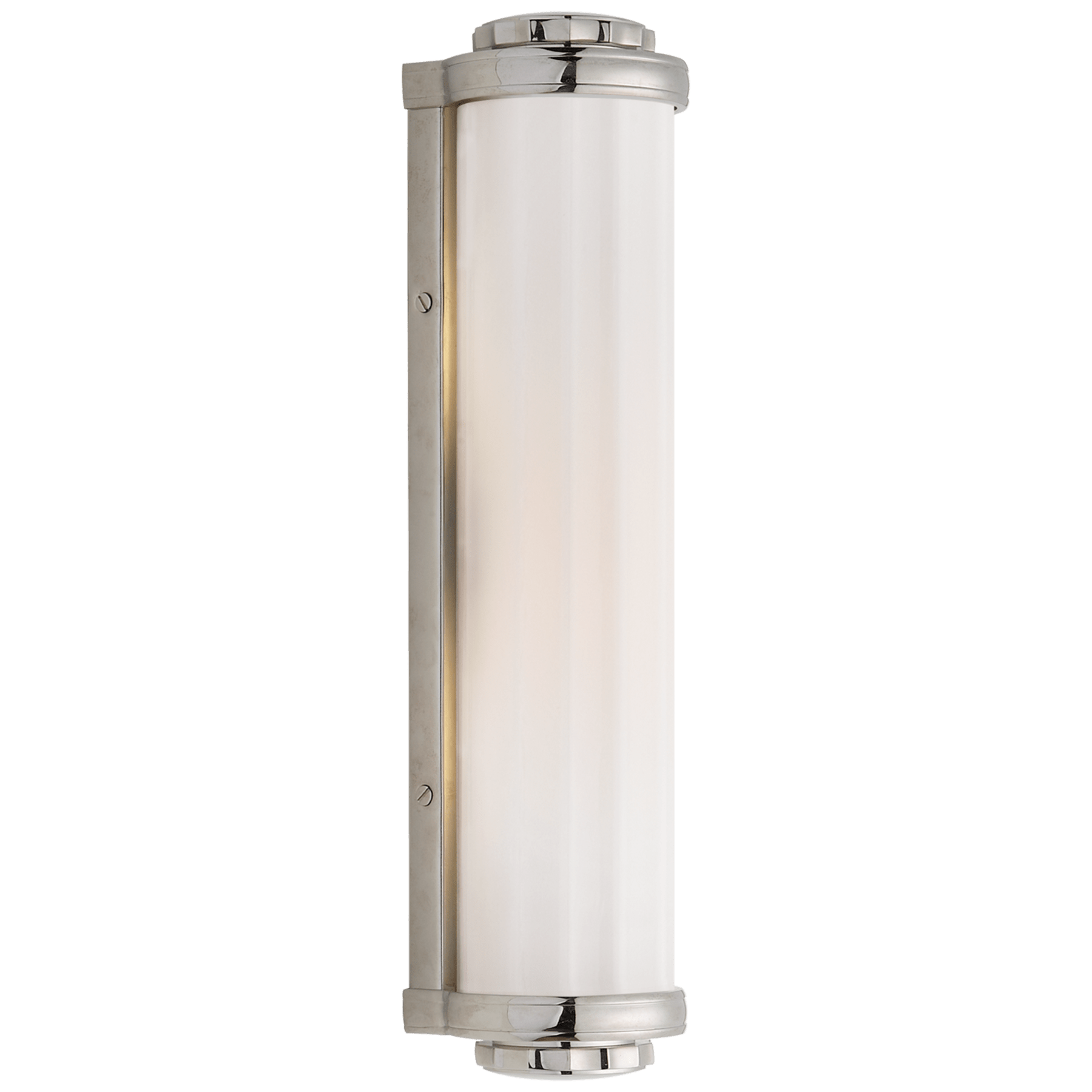 Классический настенный светильник для ванных комнат выполнен в виде закрытого с обоих сторон цилиндра со стеклянным экраном молочного цвета. Подходит для влажных помещений