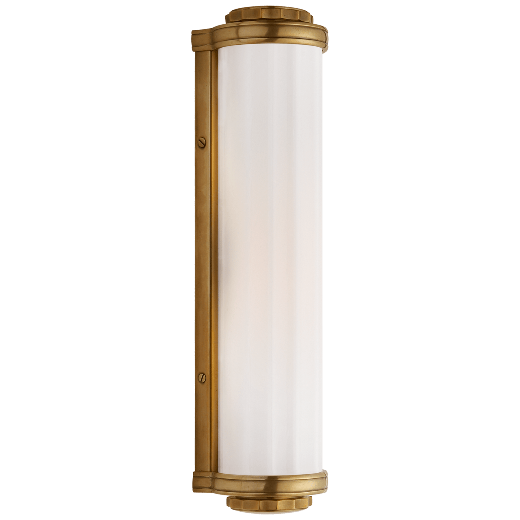 Классический настенный светильник для ванных комнат выполнен в виде закрытого с обоих сторон цилиндра со стеклянным экраном молочного цвета. Подходит для влажных помещений. Выполнен из натуральной состаренной латуни.