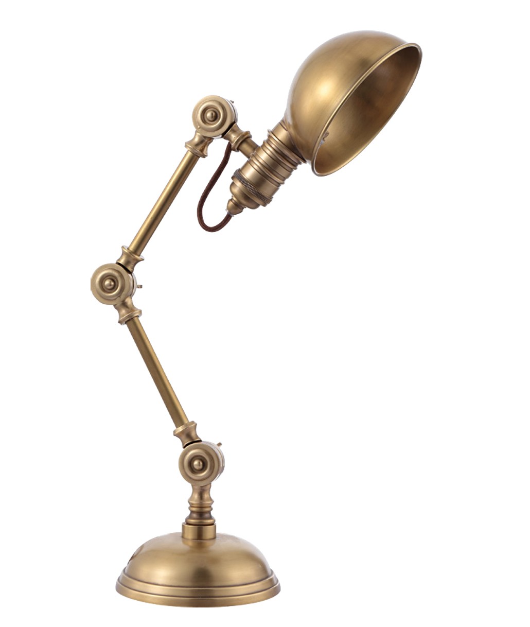 Настольная лампа в индустриальном американском стиле из состаренной латуни или полированного никеля обеспечивает не только свет в любом направлении, но и отличный полёт фантазии. Наиболее универсальная модель, которая прекрасно будет дополнять как рабочий стол, так и прикроватную тумбу.