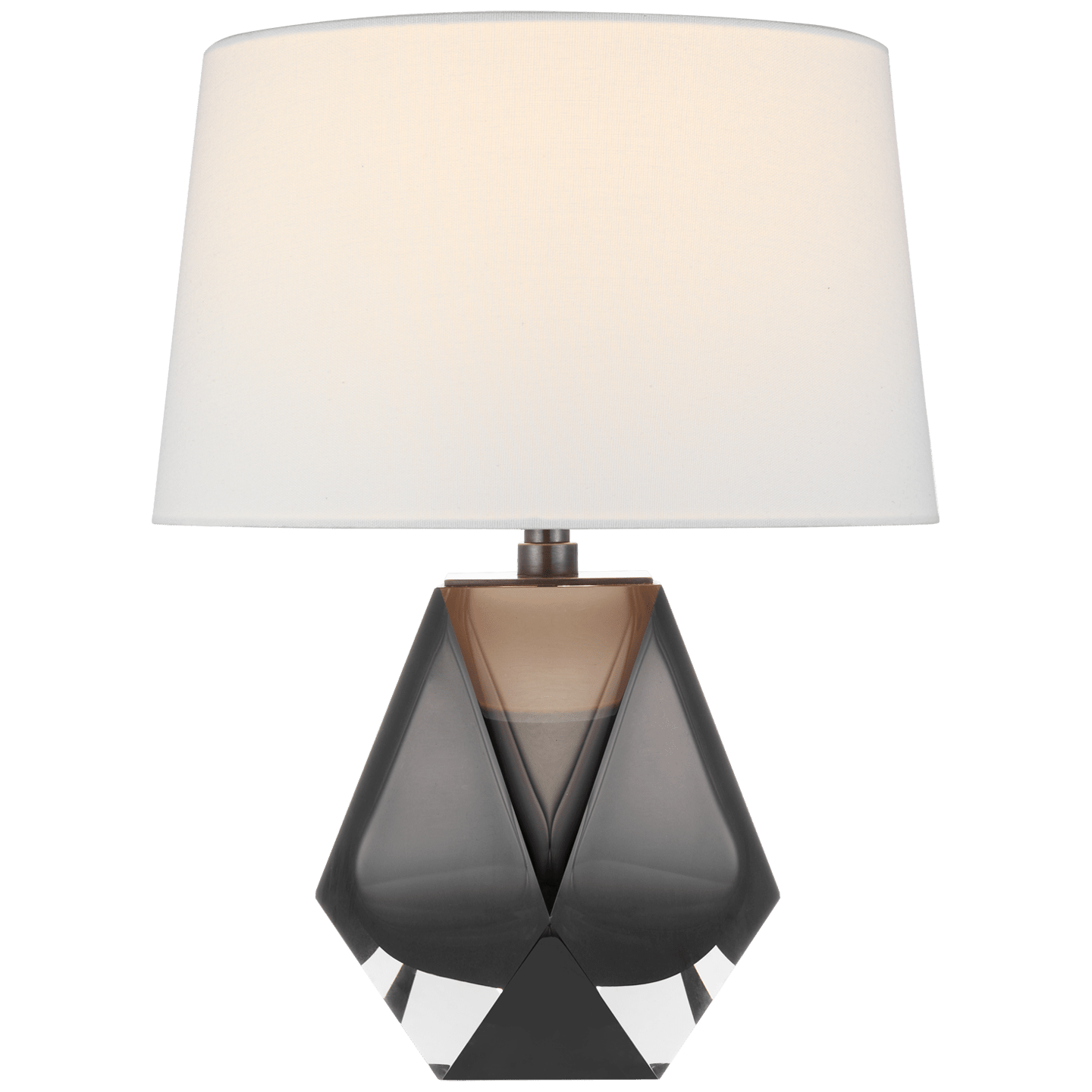 Настольная лампа Chapman & Myers Gemma Medium Lamp от Visual Comfort имеет ромбовидное основание, изготовленное из толстого дымчатого стекла. В Gemma также присутствует нотка латуни на фурнитуре, а также слегка зауженный льняной абажюр. Для этой настольной лампы требуется одна светодиодная лампочка A27 мощностью 15 Вт, которую можно приглушить с помощью встроенного диммера лампы.