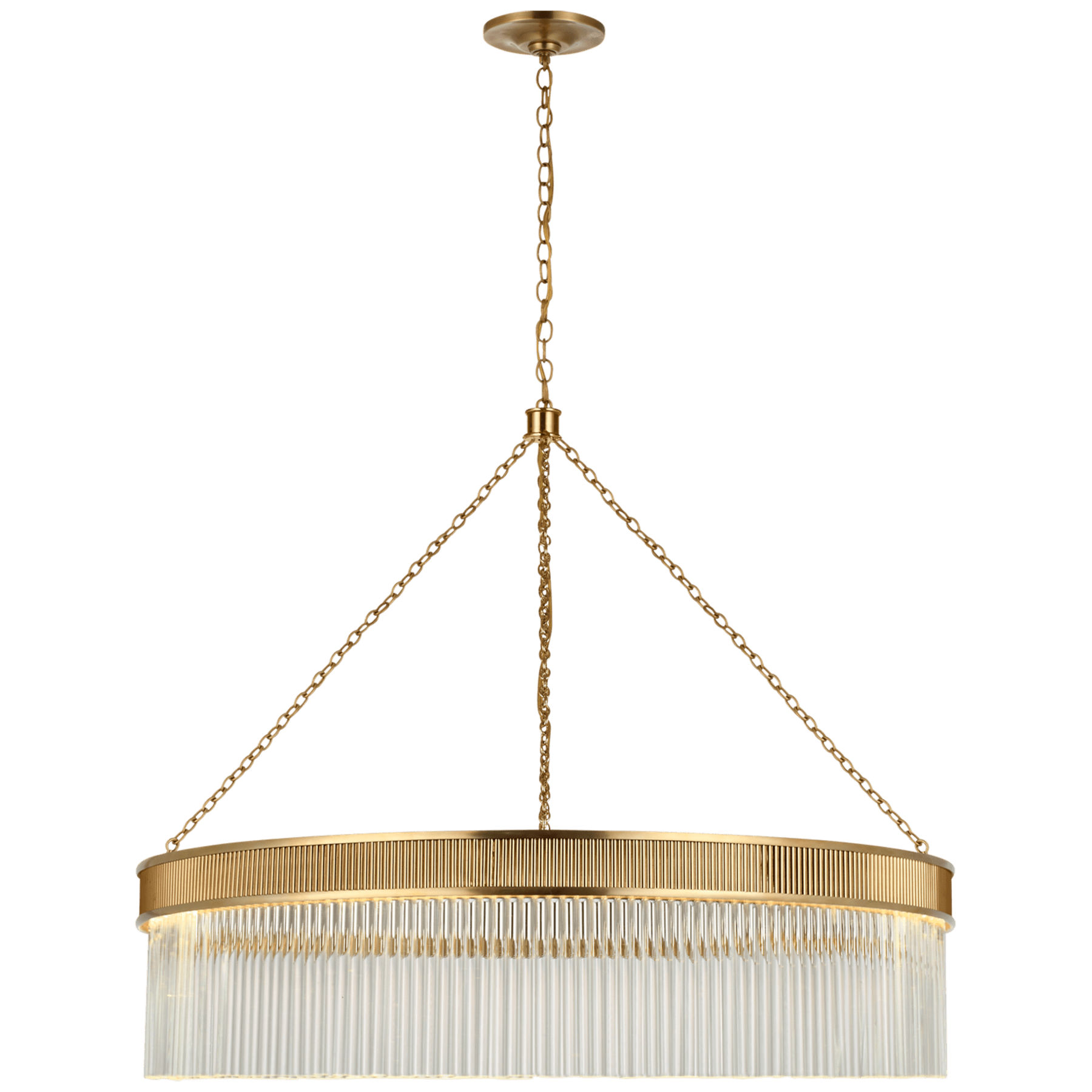 Большая люстра Visual Comfort Menil от Marie Flanigan выполнена в форме кольца со стеклянными стержнями. Люстра доступна в двух вариантах ширины и высоты и отличается элегантной металлической отделкой из бронзы, латуни или полированного никеля. Подвешенный на тонких звеньях цепи, Menil может заявить о себе в одиночку на кухне или в фойе, а также в нескольких местах в коридоре.